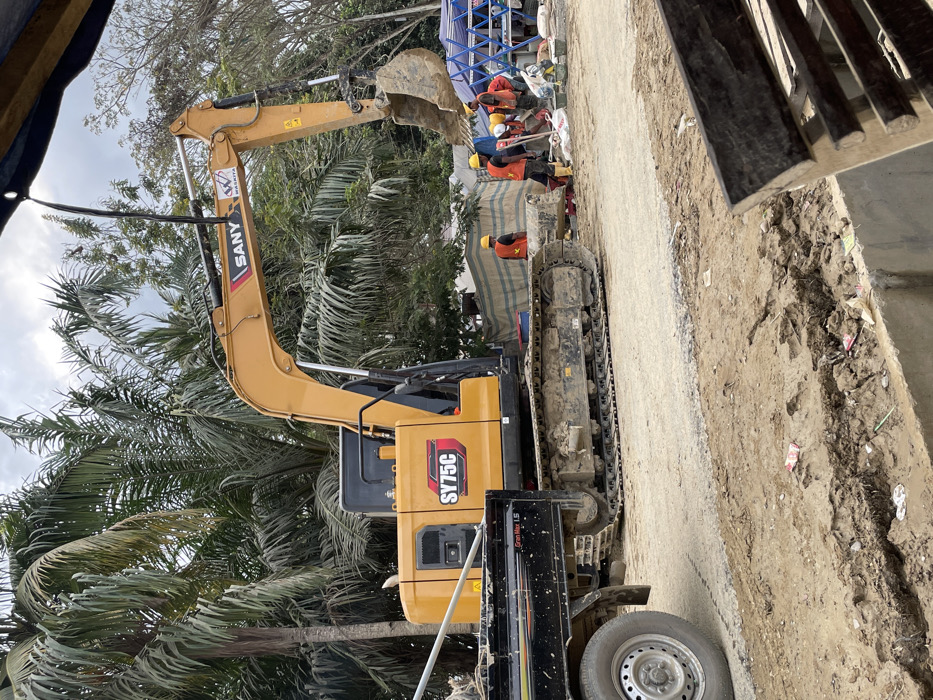 A daytime scene depicts an active construction site in Bundar, Indonesia, under an overcast sky