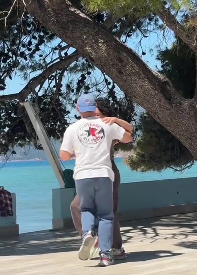 A couple is slow dancing under a tree on a wooden platform. The man is wearing a white t-shirt, blue pants, a blue baseball cap, and sneakers. The woman has dark hair and is wearing a green top and patterned pants. They are embracing and moving gently to music that is audible in the background. The platform overlooks a body of water. Behind the couple are trees and bushes. The day appears sunny.
