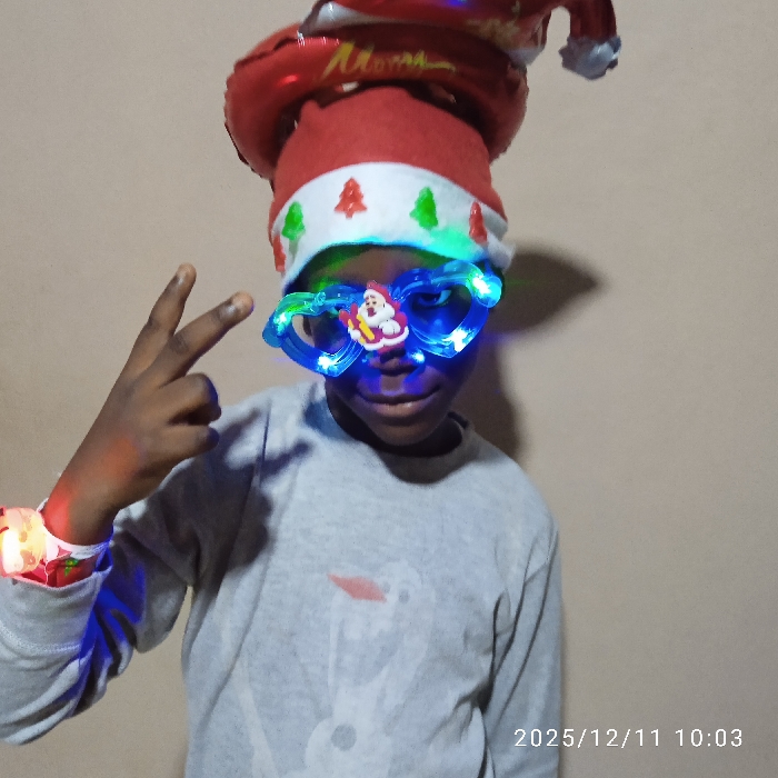 The scene is located in Agege, Nigeria. A child, of apparent Nigerian descent, is captured in a front-facing, head-and-torso image. The child wears a red and white Santa hat adorned with green and red Christmas tree motifs. Stacked on top of the Santa hat is a partially inflated red foil balloon, possibly a Christmas-themed figure, displaying faint yellow script. Blue, heart-shaped novelty glasses with illuminated LED lights and a small three-dimensional Santa Claus figure on the bridge are worn over the eyes. A grey long-sleeved t-shirt, featuring a faded graphic on the chest, covers the child's torso. A light-up wristband, emitting red and green light, is present on the child's left wrist. The child's left hand is raised to the side of the head, displaying a "V" or peace sign with the index and middle fingers extended. The background consists of a uniform, light beige wall. A digital timestamp "2025/12/11 10:03" is visible in the bottom right corner of the image.