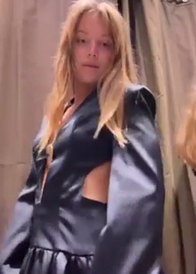 A woman with long blonde hair stands in a dressing room. She is wearing a long-sleeved, black, satin-like dress with a cutout at the waist and a plunging neckline. The dress has a large, round, gold-colored clasp at the neckline. She turns slightly to show the side cut-out. The dressing room has a beige curtain background. Another person is partially visible in the mirror.