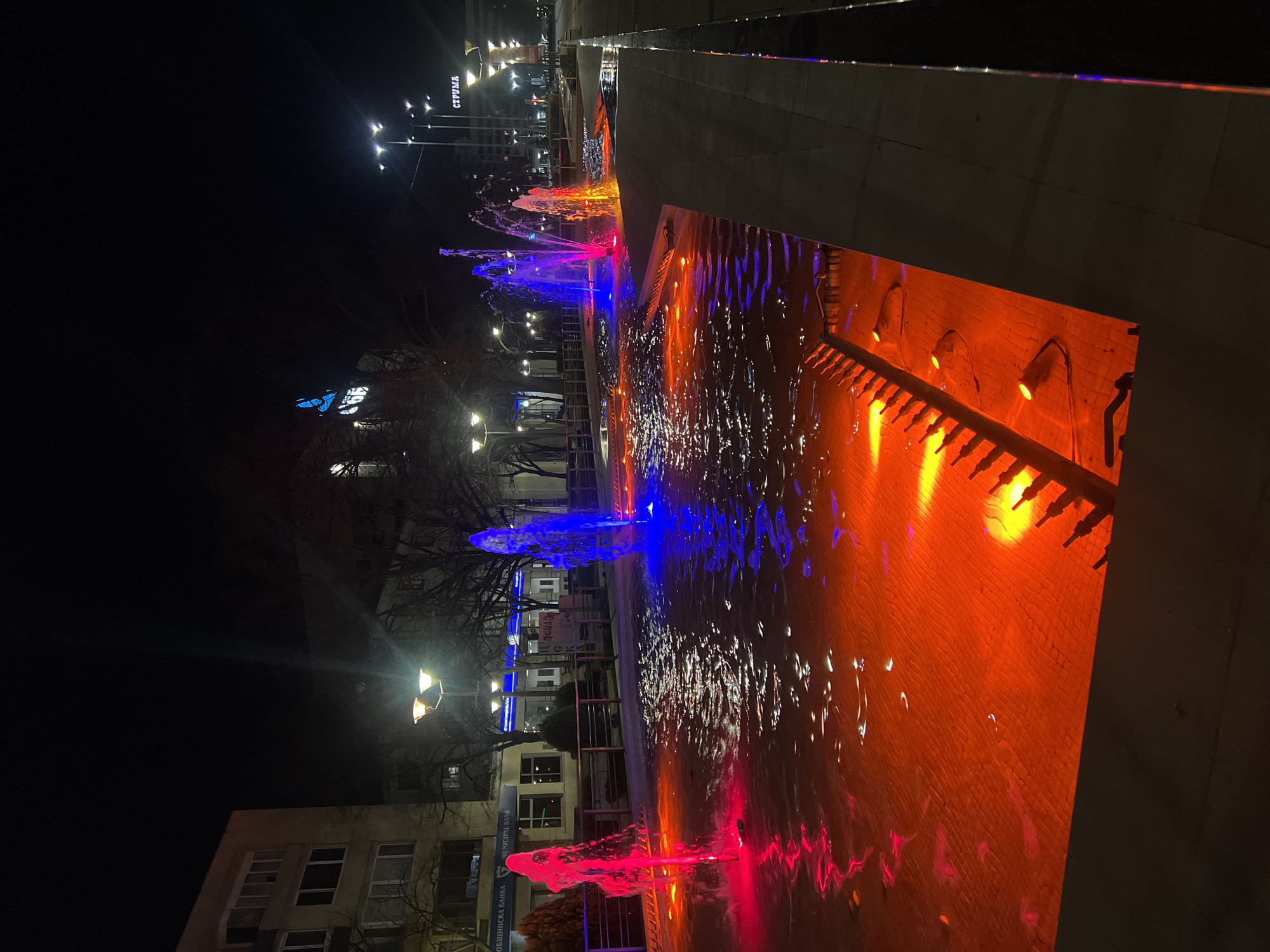 The image captures a nighttime scene in Pernik, Bulgaria, featuring a fountain illuminated by colored lights