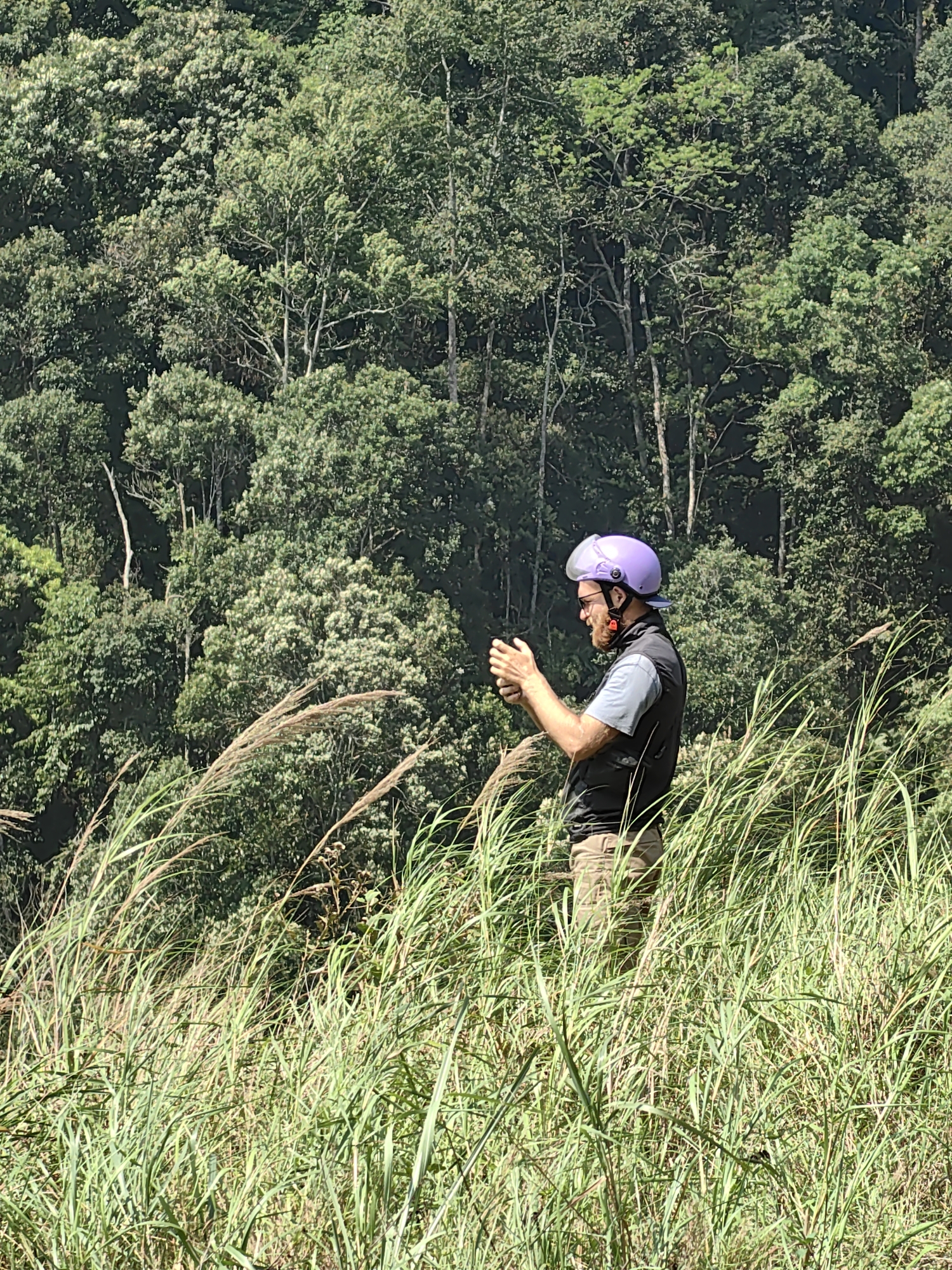 The image depicts a man standing in tall grass in Lùng Tám Commune, Vietnam. He is wearing a light blue t-shirt, a dark vest, khaki pants, and a purple helmet with a clear visor. He has a beard and is wearing glasses. He appears to be clapping his hands together. The background consists of a dense green forest covering the side of a hill. The foreground is filled with tall grass. The lighting appears to be bright and natural.
