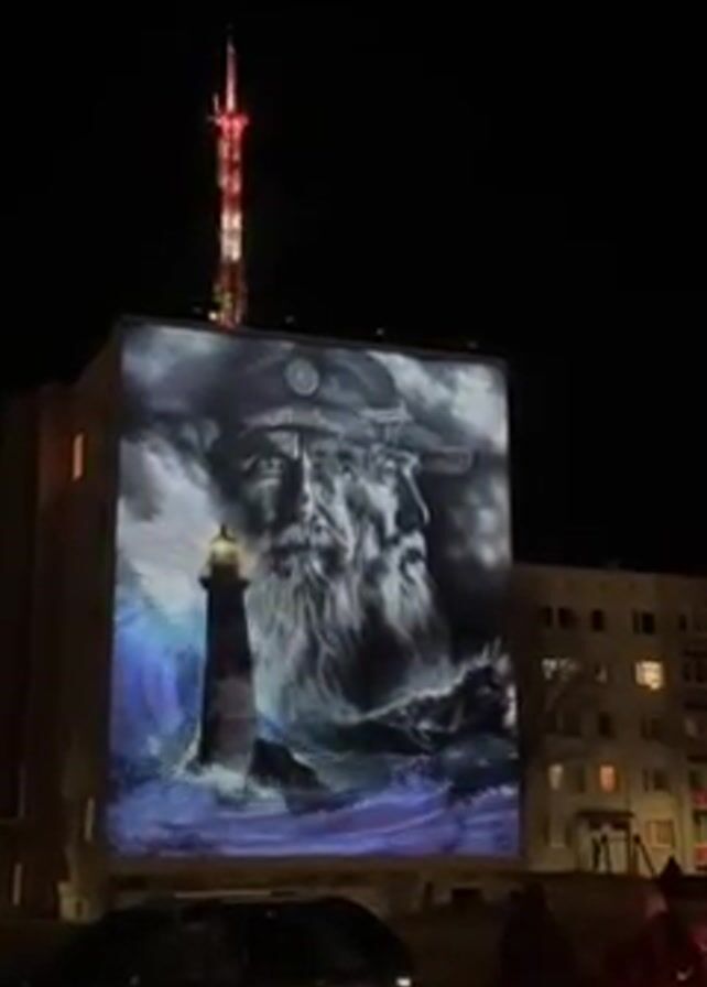At night, a large projection adorns the side of a building, depicting an old sea captain with a weathered face and long white beard, set against a stormy ocean backdrop with a lighthouse. Above the building, a tall, red-and-white communications tower pierces the dark sky. Below, a black car is parked, and cyclists pass by, observing the display. Windows of another building across from the projection are visible.
