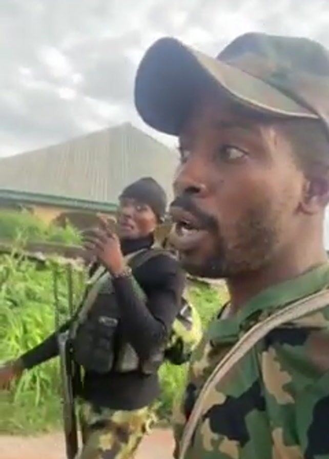two individuals in military camouflage outfits walking outside. The person filming is in the foreground wearing a cap and uniform, while the other individual is walking slightly behind and to the side, also in military attire, carrying a rifle and wearing a black top with tactical vest. They appear to be engaged in conversation. The background shows a building, some greenery, and an overcast sky.