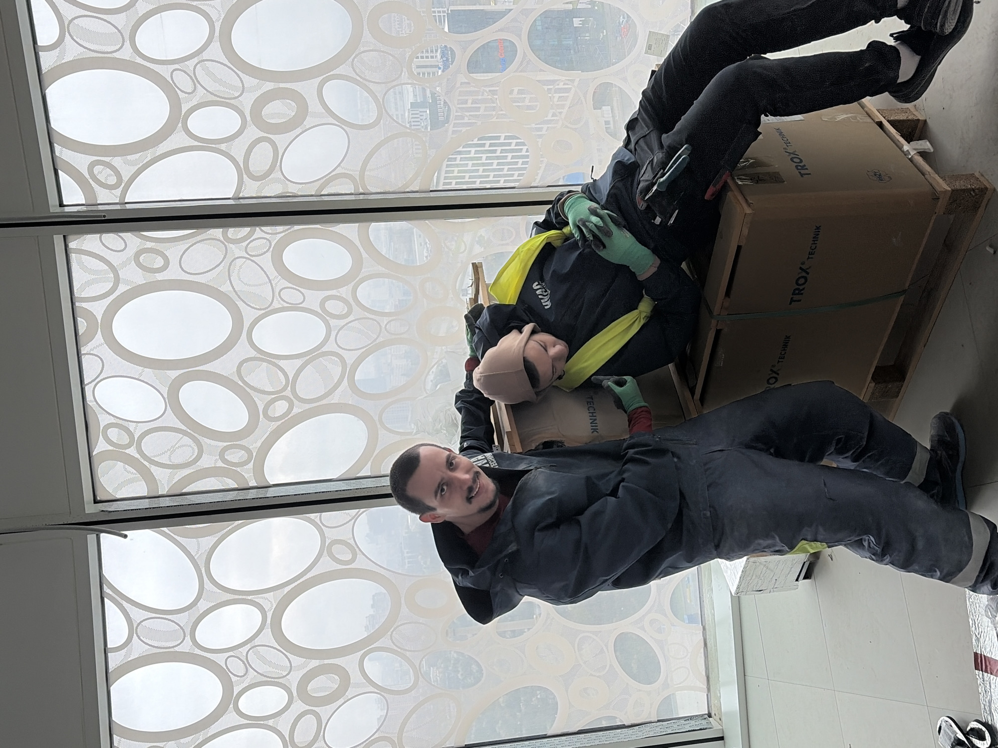 Two male workers are positioned indoors near a window, working on a project. One is standing and faces the camera with a smile. He is wearing a dark blue/gray jacket and dark pants. The second worker is partially sitting on a large cardboard box branded "TROX TECHNIK". He is wearing a dark jacket, a yellow safety vest, and a beige beanie. The window behind them has an abstract white circle pattern and overlooks what appears to be a cityscape. Buildings are visible outside the window, suggesting an urban setting. The location is identified as Sofia, Bulgaria.