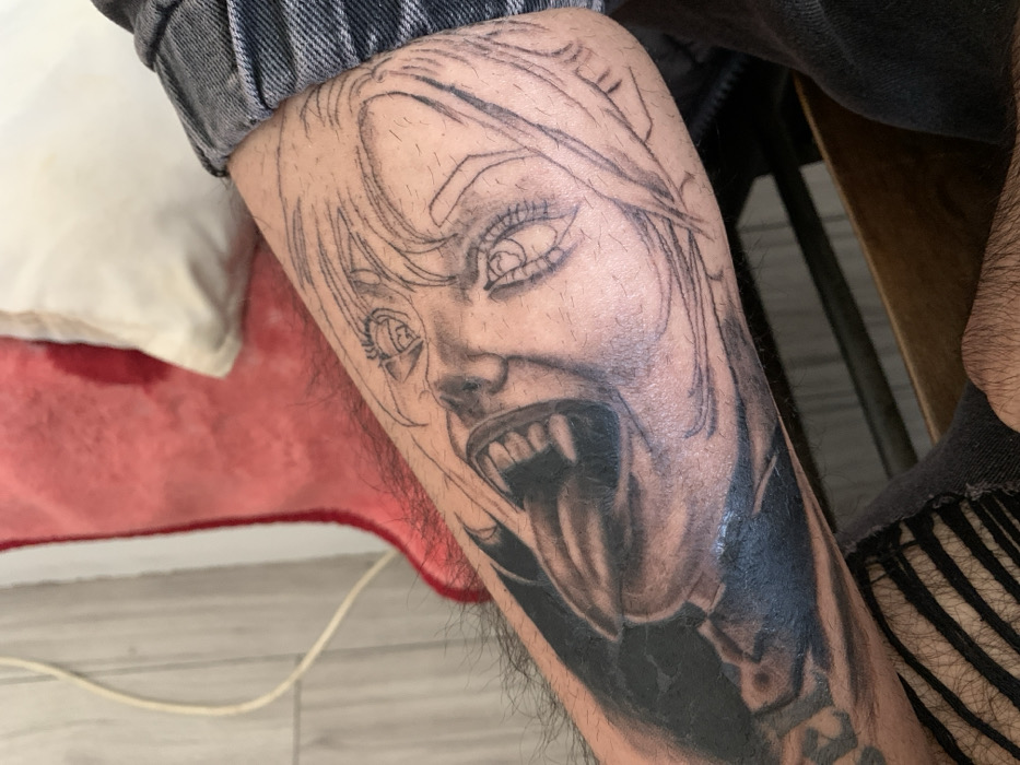The scene is located in the city of Goliam Izvor, Bulgaria. The primary subject is a human forearm, displaying a prominent tattoo. The tattoo depicts a stylized face, rendered with a combination of shading and line art. The face appears to be screaming, with an open mouth showing teeth and an exaggerated expression of distress or agony. The eyes are wide and detailed. Part of the tattoo is fully shaded in black and grey, while other sections, particularly towards the right side of the image, are rendered as outlines, suggesting an unfinished or artistic style choice. The skin around the tattoo exhibits fine hair. The individual is wearing a dark, possibly plaid or striped, long-sleeved shirt, visible at the top right. Below the forearm, a dark, striped fabric, possibly part of another garment, is visible. The background consists of a light-colored wooden floor or wall, against which a thin white cable runs vertically. A large red fabric object, resembling a Christmas stocking, is partially visible, and next to it, a portion of a white or cream-colored pillow or cushion is present. The overall lighting suggests an indoor environment.