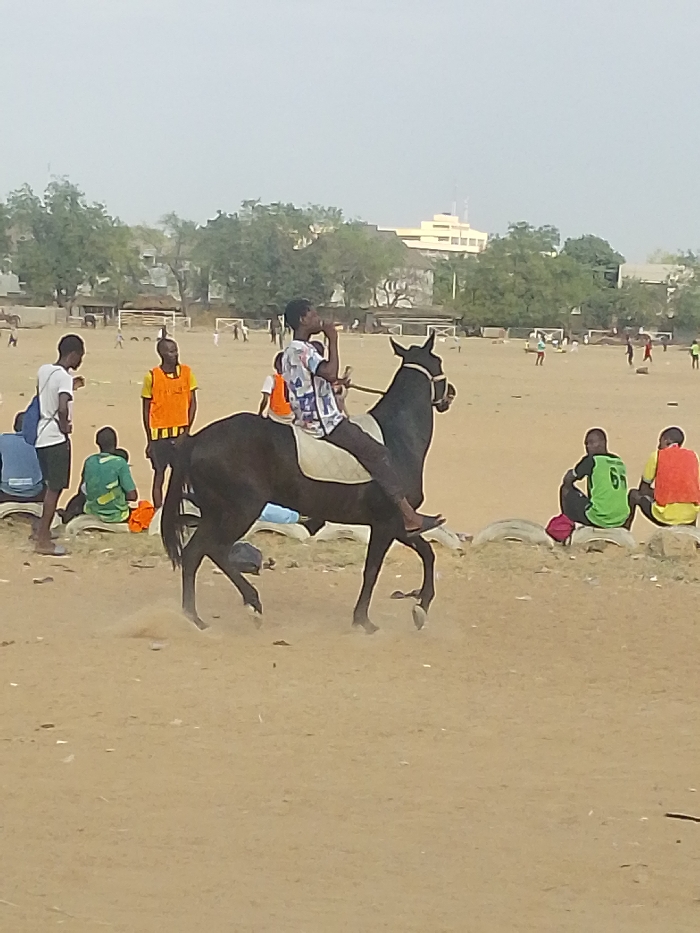 A young man rides a dark horse without a saddle in a sandy field. Several people watch, some in athletic gear and others in casual wear. A building and several trees can be seen behind the field with a soccer field in the distance. The horse is in motion, stirring up dust, and the rider is holding reins.