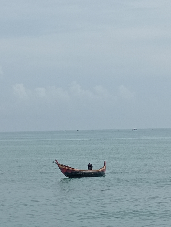 A small, open fishing boat rests on calm, blue-green water under an overcast sky. The boat is dark, likely made of wood, and has distinctive curved prows. A single figure stands in the boat, facing away from the viewer. In the distance, several other boats are visible on the horizon. The overall scene is serene and depicts a simple life connected to the sea.