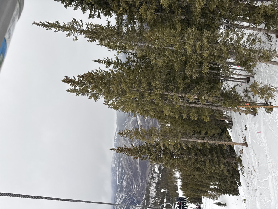 A mountain scene displays snow-covered terrain and evergreen trees. A chairlift cable spans the foreground, suggesting a ski resort. Mountains are visible in the distance, shrouded in mist. The view, captured from the chairlift, shows a dense tree line along the ski slope. A cloudy, overcast sky creates a muted color palette. Skiers on the lifts are visible in the lower portion of the image.