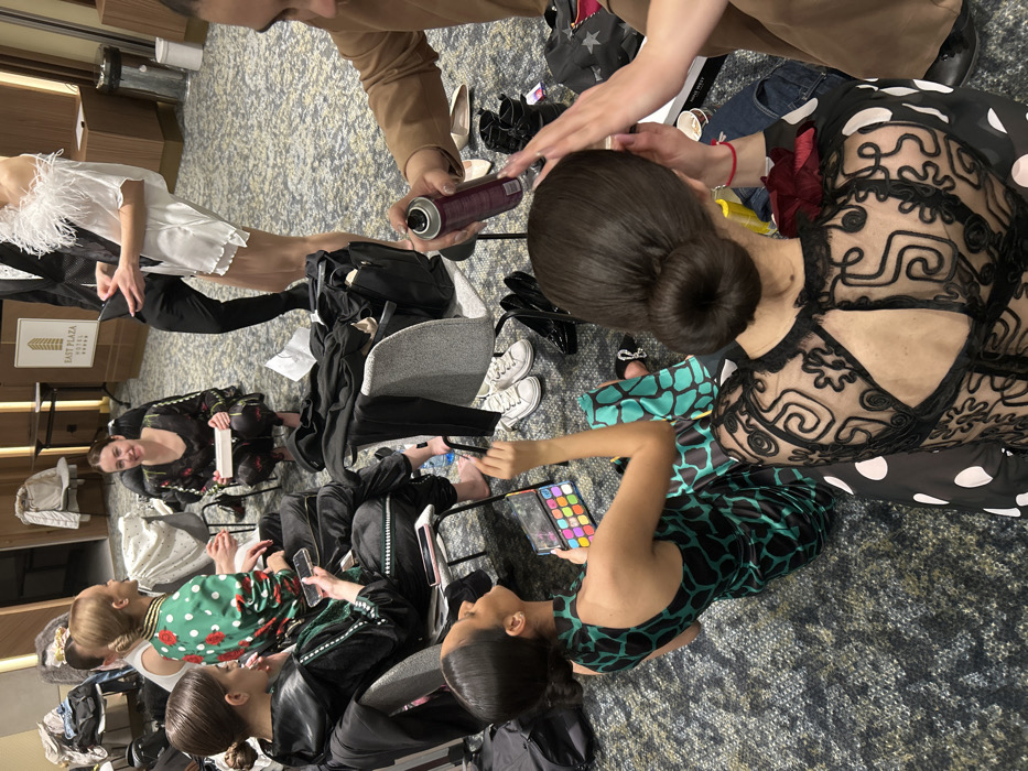 The image depicts a crowded backstage or preparation area within the East Plaza Hotel & Apartments in Sofia, Bulgaria. The room is carpeted with a grey patterned design, and light-colored panels adorn the walls. Seven individuals are present, engaged in pre-event preparations. In the foreground, viewed from behind, a person with dark hair styled in a tight bun wears a black sheer top with intricate black embroidery and large white polka dots, accented by a red floral embellishment on the left shoulder. Another person, partially visible on the right, uses both hands to style the bun, holding a purple aerosol can of hairspray to the top of the head. To the left, another person with dark hair in a similar bun sits directly on the floor, wearing a high-necked, sleeveless dress or top with a distinctive green and black abstract pattern. This individual holds an open, multicolored makeup palette in their left hand and a brush in their right, appearing to apply makeup to their face. Further into the scene, a person seated on a grey upholstered chair is seen from the back, wearing a green jacket with red polka dots and floral designs, holding a smartphone. Adjacent to them, another person is seated, wearing a black athletic tracksuit with white stripes, also holding a smartphone; their bare feet are visible. In the mid-background, a barefoot female crouches on the floor, wearing a dark patterned long-sleeved garment. She smiles directly towards the camera, holding a small white rectangular object. To the right, a person's upper body is visible, dressed in a black suit jacket and white shirt, holding a dark object. Adjacent to them, a female stands wearing a short white top with feathered shoulders and apparent sheer hosiery. Miscellaneous items are scattered throughout the floor, including black bags, white sneakers, black high heels, a small water bottle, and discarded clothing. A silver trash bin is visible in the background, near a wooden console table.