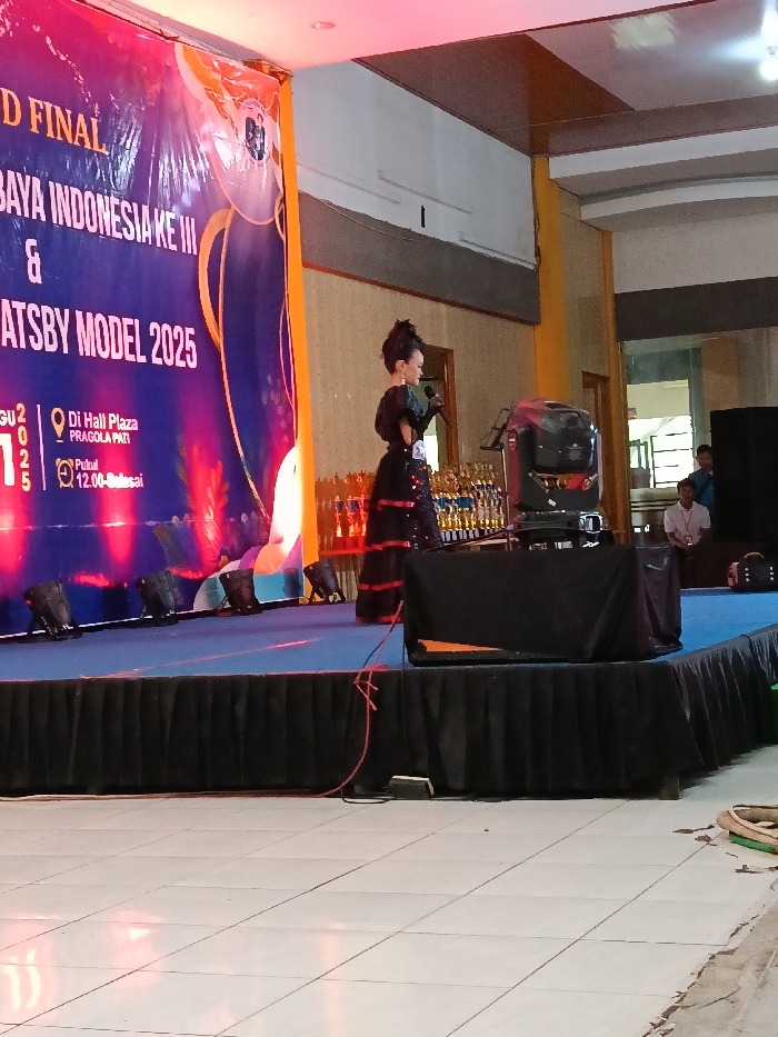 A woman in a black and red dress stands on a stage with a microphone, presumably speaking. Behind her is a banner with the words "GRAND FINAL" and "GATSBY MODEL 2025." Trophies are visible on a table next to a lighting fixture. In the background, seated individuals can be seen through a doorway. The stage is decorated with a black ruffled skirt. The setting appears to be a hall or auditorium.