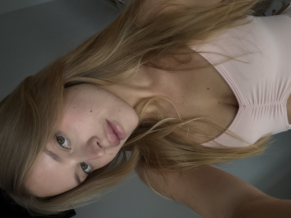 The image presents a close-up, slightly angled selfie of a young adult female, depicted from the upper chest upward. She has long, straight to slightly wavy blonde hair, parted on the right side, which flows over her shoulders and partially obscures the right side of the frame. Her face is illuminated directly, revealing fair skin with scattered small moles or freckles on her cheeks, nose, and chin. Her eyes are light green, and her lips appear full with a glossy finish. She is wearing a light pink, possibly synthetic, top featuring thin shoulder straps, a V-neckline, and horizontal ruching or gathering across the center of the chest, above a visible cut-out on her torso. The background is uniformly dark gray and indistinct, providing no discernible features, objects, or patterns, indicative of an indoor setting with low or limited background lighting. No specific location in Hrodna, Belarus, or any other city can be determined from the visual information present in the scene.