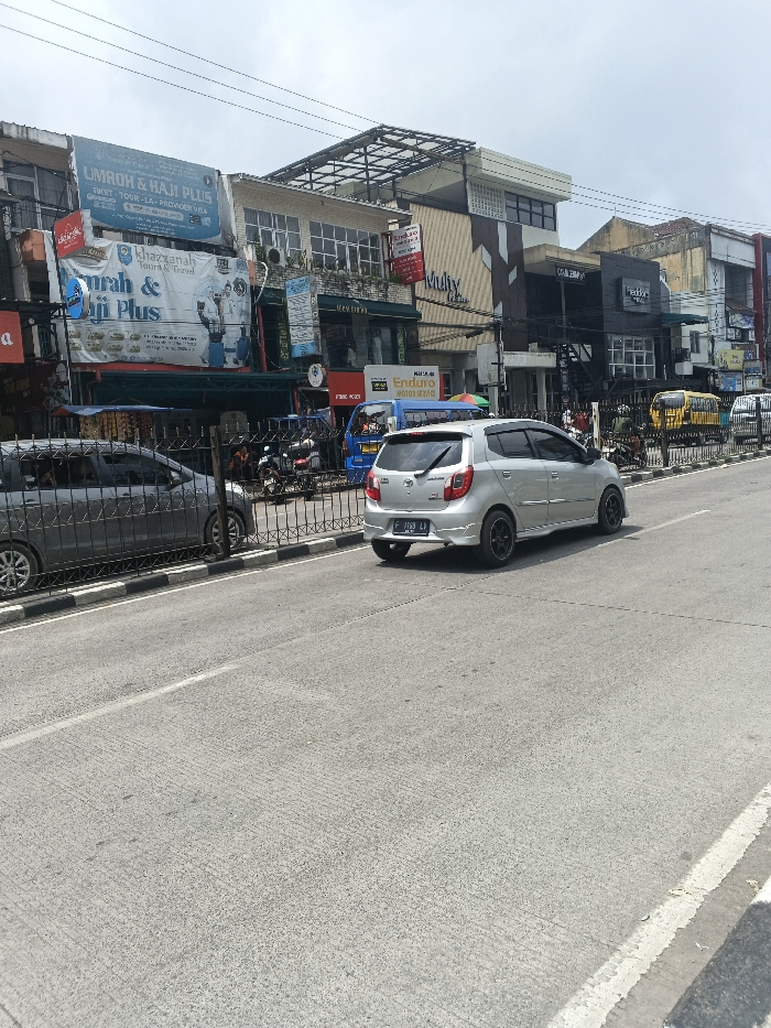 This image depicts a busy urban street scene in the city of Sariaya, Philippines, under an overcast sky. The foreground features a grey paved road, likely concrete, with a faint white line marking a lane division. To the left, a black and white striped curb separates the road from a sidewalk, along which runs a low, black ornamental metal fence. A silver Toyota Agya hatchback, bearing license plate F 1709 LY and equipped with black wheels, occupies the right lane, moving away from the viewer. Partially visible in the far left lane, adjacent to the fence, is the front half of a dark grey sedan, appearing stationary. Beyond the fence, a row of multi-story commercial buildings lines the right side of the street. These structures exhibit varied architectural styles and house multiple businesses. Prominent signage includes large blue banners advertising "UMROH & HAJI PLUS" and "Khazzanah Tours & Travel," alongside a red banner for "ENDURO MOTOR SERVICE." Other visible business names include "Muly," "Green Kitchen," and "Kedai Kopi." Several motorcycles are parked or navigating the area in front of these shops, behind the metal fence. A blue pickup truck with a canopy is positioned near the "Enduro Motor Service" sign, and a yellow passenger vehicle is visible further down the street. Indistinct human figures are present on the sidewalk area, some standing near the shops. Overhead utility lines crisscross against the uniformly light grey, overcast sky.