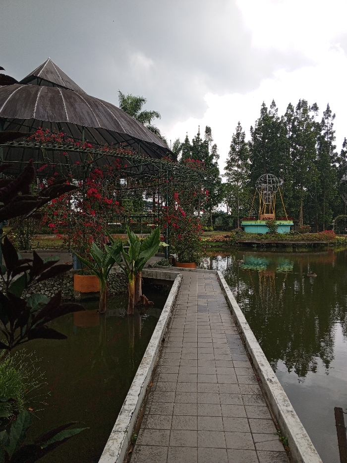 A stone pathway extends over a dark pond, lined by lush vegetation. A large domed structure, adorned with red flowering vines, stands to the left. In the background, green trees frame a metallic sphere-like sculpture on a small island in the pond. The sky is overcast, adding a somber tone to the scene. The water reflects the surrounding environment, creating a mirror-like effect.