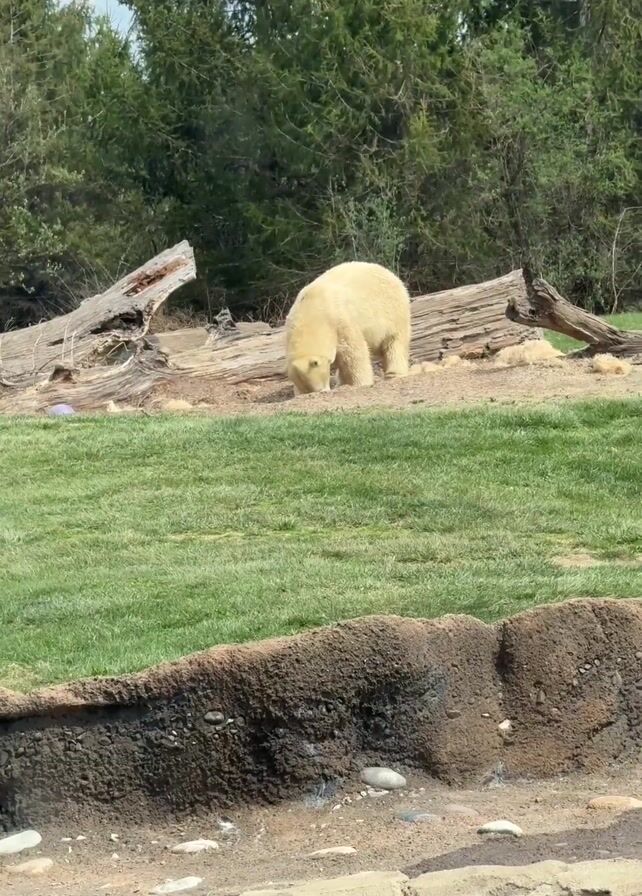 A polar bear is the focal point of the video, positioned in an open area of a zoo exhibit