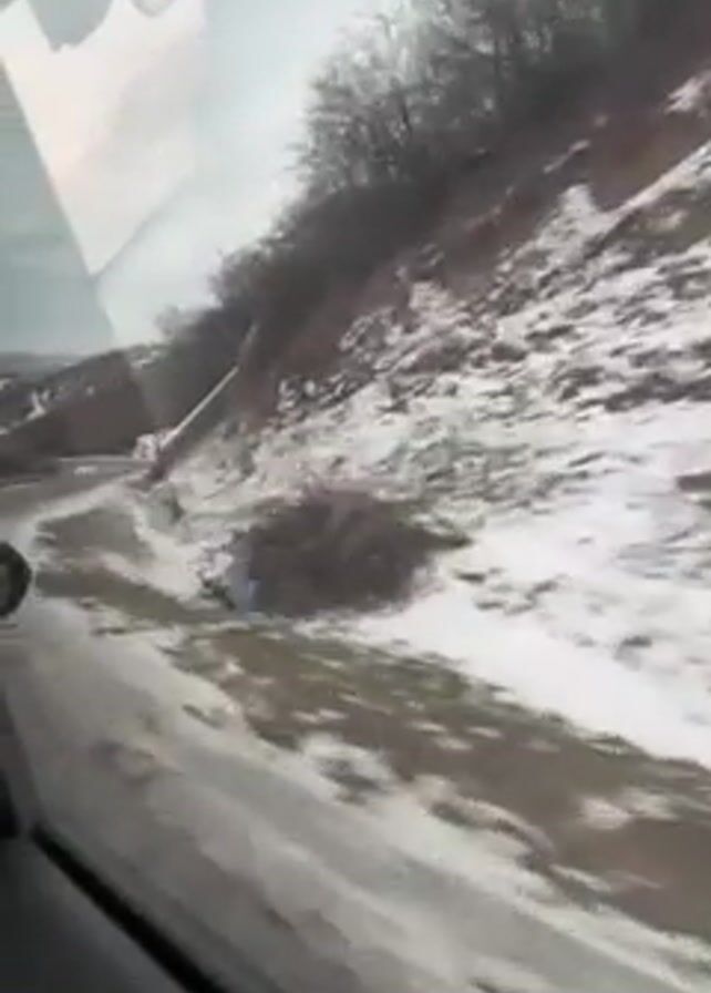 snowy landscape from the perspective of someone inside a moving car. The road is partially covered in snow and the adjacent hillside is also blanketed with snow. Bare trees are visible atop the hill. The camera is positioned inside the vehicle, offering a view through the car window. The movement of the vehicle implies travel, and the snowy environment suggests a winter setting. The overall tone is bleak and cold due to the sparse, snow-covered scenery.