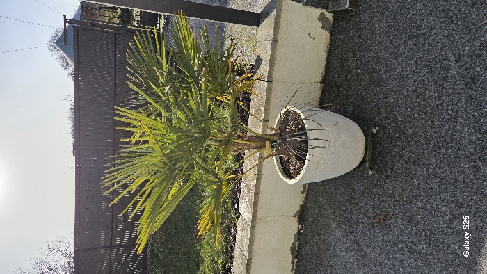 The image depicts an outdoor scene, specifically a residential or garden area, under bright sunlight from the upper left, causing strong backlighting and lens flare. The exact location within Ottonville, France, is not discernible from the visual content. In the foreground, a dark grey, speckled aggregate surface, consistent with a paved area or driveway, covers the lower half of the frame. A single dried leaf is present on this surface in the bottom left quadrant. A medium-sized palm plant, possessing numerous green, fan-shaped fronds, some exhibiting yellowing or browning at their tips, is centrally positioned. It is contained within a light grey, slightly tapered pot, likely made of concrete, with dark soil visible around the plant's base. Immediately behind the potted palm, a low, white-painted concrete wall with a grey coping stone extends horizontally across the mid-ground. The white paint on this wall shows signs of wear and localized peeling. A patch of green grass is visible behind the left portion of this wall. The background features a dark brown, horizontally slatted wooden fence, acting as a boundary. Above the fence, against a bright, hazy sky, bare tree branches are visible. To the far right in the background, a dark, pyramid-shaped architectural feature is partially discernible above the fence line. No individuals are present in the frame, and no specific actions or interactions are depicted.