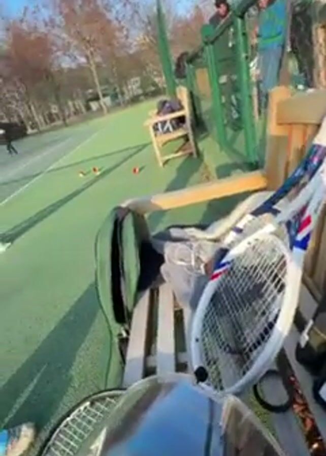 The video opens with a view of a tennis bench laden with tennis equipment: tennis rackets, Wilson tennis ball containers, a green tennis bag, and a bottle