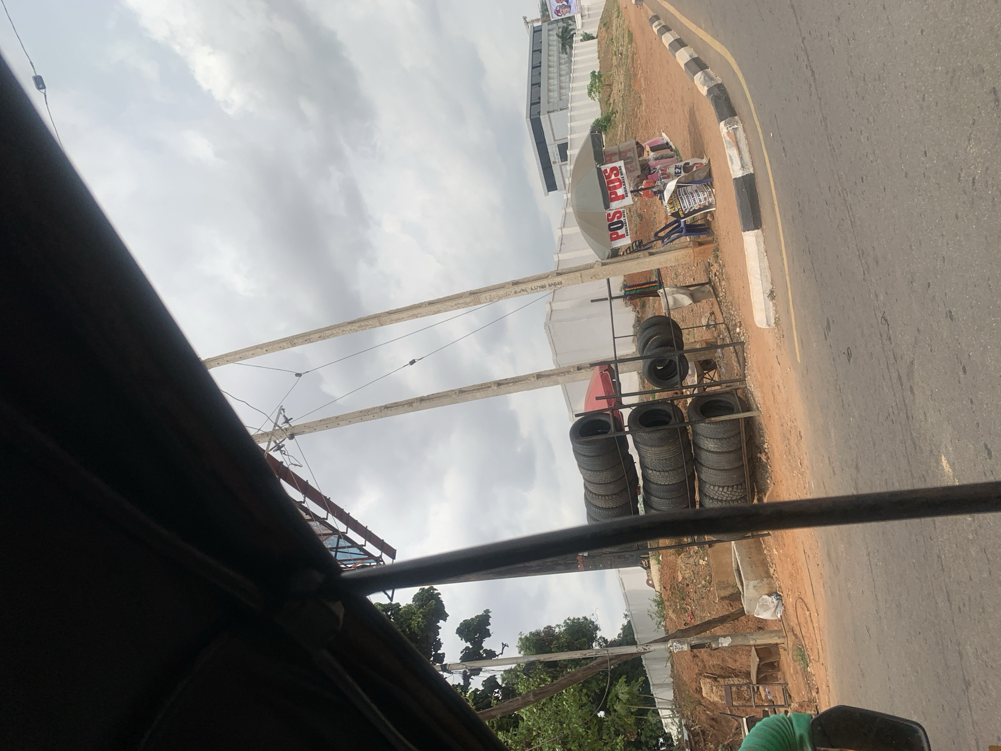 The image, captured from within a vehicle, depicts a roadside scene in Enugu, Nigeria, near the Golden Tulip Hotel. On the left, a tire sales/repair area features numerous tires stacked on metal racks, situated on reddish soil adjacent to two wooden utility poles and green foliage. A white concrete perimeter wall runs behind this, bordering an elevated expanse of disturbed reddish earth. On the right, an asphalt road with a yellow centerline and a black-and-white striped curb parallels the scene. Adjacent to the curb, a vendor operates a POS (Point of Sale) service under a green umbrella, marked by two "POS AVAILABLE HERE" signs. Various small packaged goods are displayed for sale, with blue plastic chairs arranged nearby. Multiple individuals, including adults and children, are present around the vendor's stall, with one adult seated under the umbrella. In the distant background, a multi-story modern building, identified as the Golden Tulip Hotel, stands beneath an overcast sky. A person wearing a green shirt is partially visible in the far left foreground.