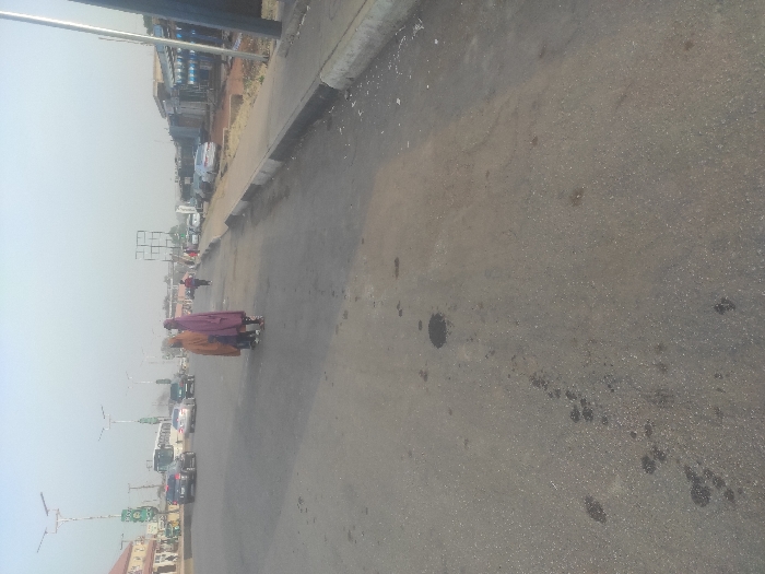 A long, gray road stretches from foreground to background, with dark, oily spots scattered across the surface. Two figures in brown and purple clothing are walking on the road. Vehicles, including cars and a bus, are visible on the left side of the road along with street lights. Buildings line the street in the distance. The sky is overcast and the light is diffused.