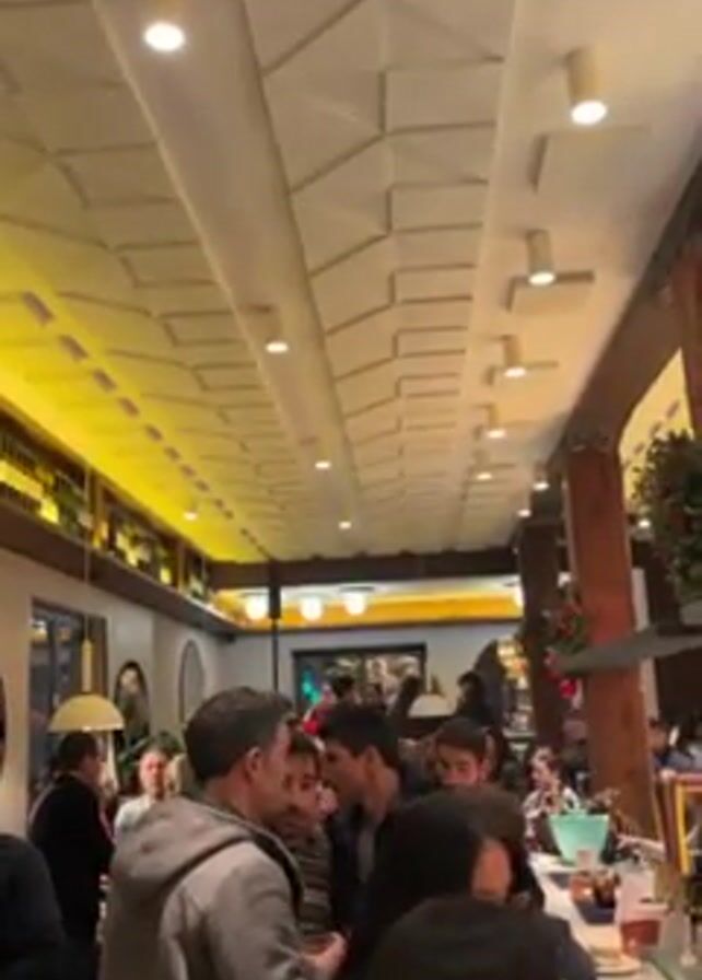 interior of a busy restaurant or bar. Several people are gathered, some standing and talking. The ceiling is decorated with a patterned design and recessed lighting. Bottles, presumably alcoholic beverages, are displayed on a shelf along the wall. The atmosphere appears lively and crowded.