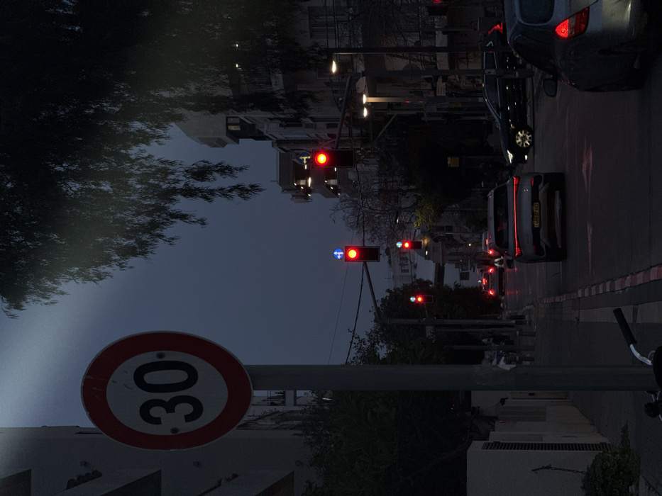 A nighttime urban scene features a "30" speed limit sign in the foreground, with a dark sky overhead. Multiple traffic lights shine red along the street, illuminating cars waiting below. Buildings line the street, illuminated by streetlights. Trees frame the scene, adding a touch of nature to the urban setting. A bicycle handlebar is visible on the right side.