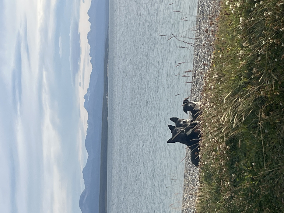 The image captures an outdoor scene at Municipio de Tolhuin, Argentina. In the immediate foreground, a strip of green grass containing small white flowers and dry stalks transitions to a pebbled shoreline. Three dogs are positioned at this juncture. The leftmost dog, primarily black with some white markings, is lying down. Partially obscured behind it is a second black and white dog, also in a resting position. To the right, a smaller, mostly black dog with white facial and chest markings is seated or lying down, facing slightly towards the viewer. Beyond the pebbled shore lies a calm body of light blue-grey water. A band of dark green forest is visible across the water in the mid-distance. The background features a long range of prominent blue-grey mountains beneath a light blue sky with scattered white and grey clouds.
