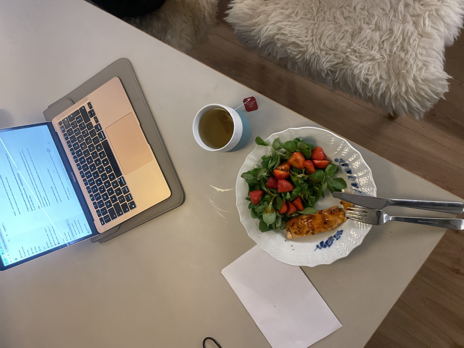 An overhead shot depicts a light-colored table in an indoor setting within Copenhagen, Denmark. A rose gold Apple MacBook Air laptop, resting on a grey protective sleeve, is open with its screen displaying a chat interface, likely ChatGPT. To the lower right of the laptop, a two-toned white and light blue ribbed mug contains a light brown liquid, presumably tea, with a red tea bag tag visible. In the lower left quadrant of the image, a white, scalloped-edge plate with blue decorative accents holds a meal consisting of a glazed salmon portion and a green salad garnished with halved strawberries and a dark dressing. A silver fork and knife are positioned beside the plate. A blank white sheet of paper lies to the left of the plate. The table surface is light grey or beige with faint white streaks. The floor beneath the table, partially visible on the right, appears to be light wood and is covered in part by a fluffy, off-white rug or sheepskin. A dark cable or cord is visible on the far left edge of the table.