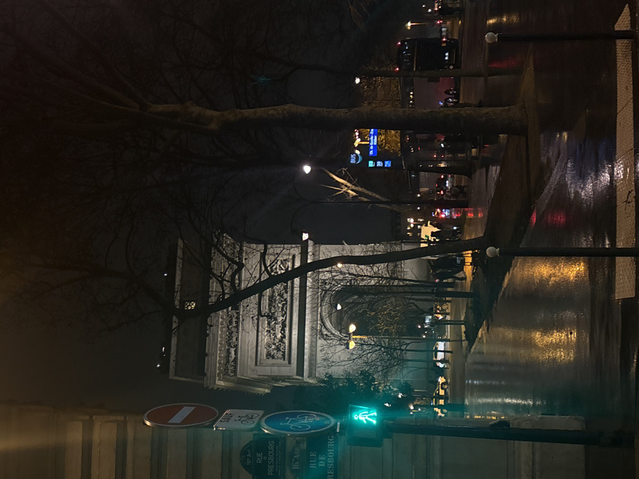 A nighttime view of the Arc de Triomphe in Paris is displayed, with the monument centered in the frame. Bare tree branches frame the Arc. The street, wet from rain, reflects the city lights. A traffic signal shows a green walking figure, and nearby traffic signs are visible. The scene has a hazy, urban atmosphere due to the rain and artificial lighting.
