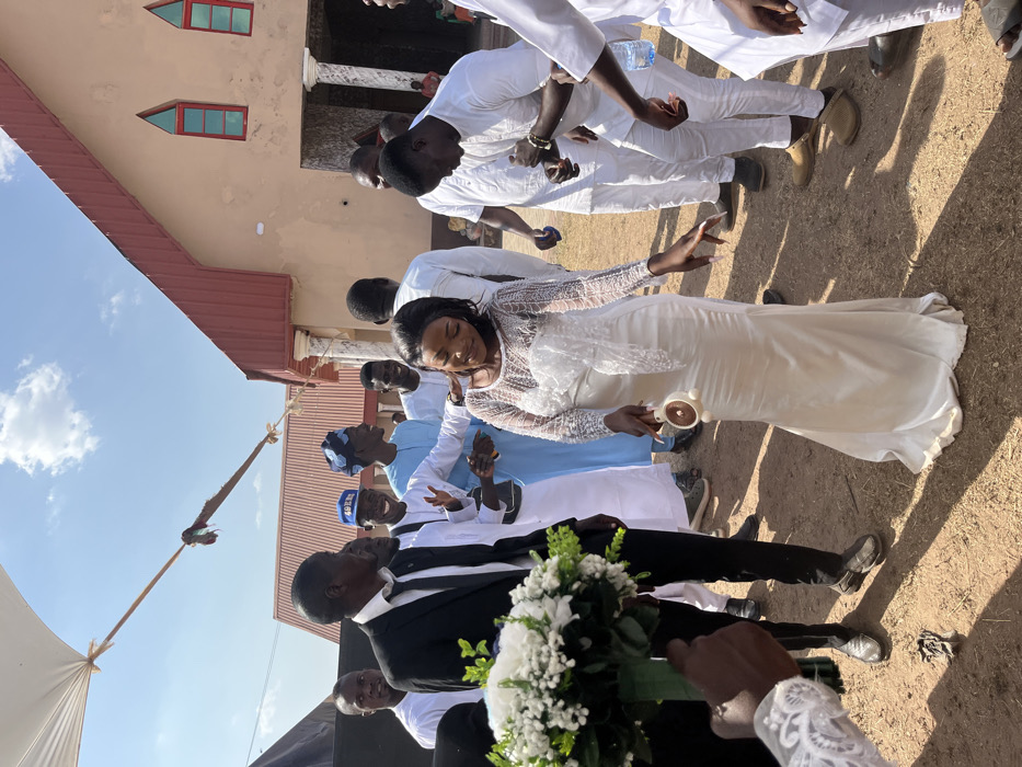 The scene depicts an outdoor gathering of approximately 15-20 individuals on a sunlit, unpaved dirt ground in Unknown, Nigeria. In the background, a building with a red corrugated metal roof, light-colored walls, and two red-framed arched windows is visible on the right. Another similar structure is partially visible to the left. A female subject, centrally positioned in the foreground, wears a long white dress featuring a lace-detailed, long-sleeved bodice and a flowing satin skirt. She has dark hair styled and is observed with a slight smile and downward gaze, holding a white-handled object with a brown circular base in her right hand. Her fingernails are long and manicured. To her immediate left, a male subject in a black suit, white shirt, and black tie holds a large bouquet of white flowers with green foliage. He wears dark, shiny dress shoes. Surrounding individuals, primarily male, are dressed in a mix of traditional Nigerian attire, predominantly white or light blue. One male, behind the central female, wears a light blue traditional outfit and a patterned blue cap, gesturing with his hands. Another male in a white outfit wears a blue baseball cap. Several individuals are smiling or observing the central figures. One male on the far right holds a clear plastic water bottle. The ground is dry, light-brown earth. The sky is clear blue with sparse white clouds. A white canopy or umbrella is partially visible at the upper left, secured by ropes. Bright sunlight casts distinct shadows across the scene.