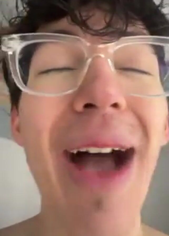young man in glasses, shirtless, looking directly at the camera