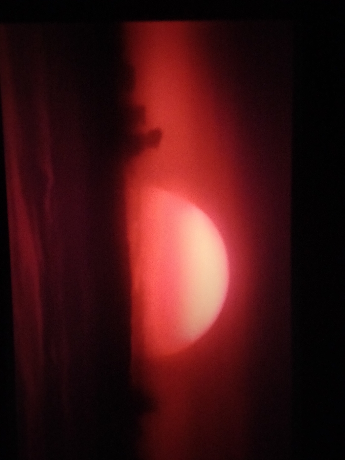 A blurry, abstract image features a prominent red color cast. A soft, round shape glows with a lighter shade of red on the right, possibly suggesting a light source. To the left, a dark, indistinct figure stands vertically, its details obscured by shadow. The scene is framed by black borders, adding to the enclosed, mysterious feel. The overall effect is atmospheric and dreamlike.