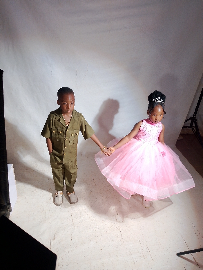 The image depicts two young children, a boy and a girl, standing in a brightly lit photographic studio environment. The background is a seamless light grey or white backdrop, extending from the floor upwards. Artificial lighting casts distinct shadows of the subjects behind and to their left. Portions of dark studio equipment, possibly light stands, are visible at the far left and right edges of the frame. The boy, positioned on the left, has short dark hair and dark skin. He wears an olive green or khaki-colored two-piece uniform-style outfit, consisting of a short-sleeved collared shirt with golden buttons and two breast pockets, and matching trousers. He has a thin golden chain necklace and wears light-colored, possibly beige or cream, slip-on shoes. His left hand is holding the girl's right hand, and his right hand is in his trouser pocket. He is looking slightly upwards towards the camera. The girl, positioned on the right, has dark skin and dark hair styled into an upright bun or puff, adorned with a silver-colored tiara. She is wearing a pink, sleeveless, floor-length gown with a voluminous tulle skirt, which features a small pink flower embellishment on its right side. The bodice of her dress appears to be embellished with sequins or beads. She wears a thin golden bracelet on her right wrist, and her light-colored shoes are mostly obscured by her dress. Her right hand is holding the boy's left hand, and her left arm is slightly bent. She is also looking slightly upwards towards the camera. The children are holding hands, suggesting a posed interaction for the photograph. The specific city of Jos, Nigeria, cannot be determined from the visual information presented in the image.