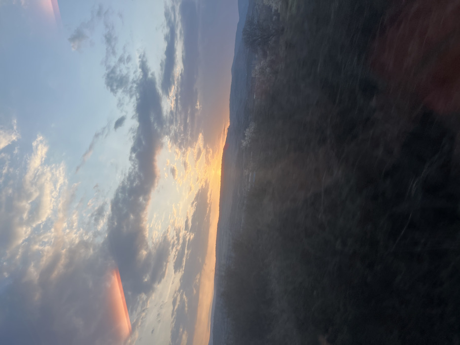 The image depicts a landscape scene at sunset in the vicinity of Blajievo, Bulgaria. The sun is positioned low on the horizon, casting a bright orange-yellow glow across the sky and illuminating the upper portions of a distant hill line. The sky exhibits scattered clouds, transitioning from orange and pink hues near the horizon to light blue and purple overhead. A distinct horizontal orange-red light streak is present in the upper left portion of the frame, suggestive of a lens flare or reflection. Sun rays emanate from the setting sun, extending into the midground. The midground consists of undulating terrain, likely hills or foothills, with dark vegetation covering much of the surface. Some trees are visible, with clusters of light-colored foliage possibly indicating spring bloom. The foreground is heavily motion-blurred and dark, suggesting ground-level vegetation or an indistinct surface viewed from a moving perspective. No individuals, specific actions, or man-made objects beyond the implied general landscape features are identifiable. The overall lighting indicates twilight conditions.