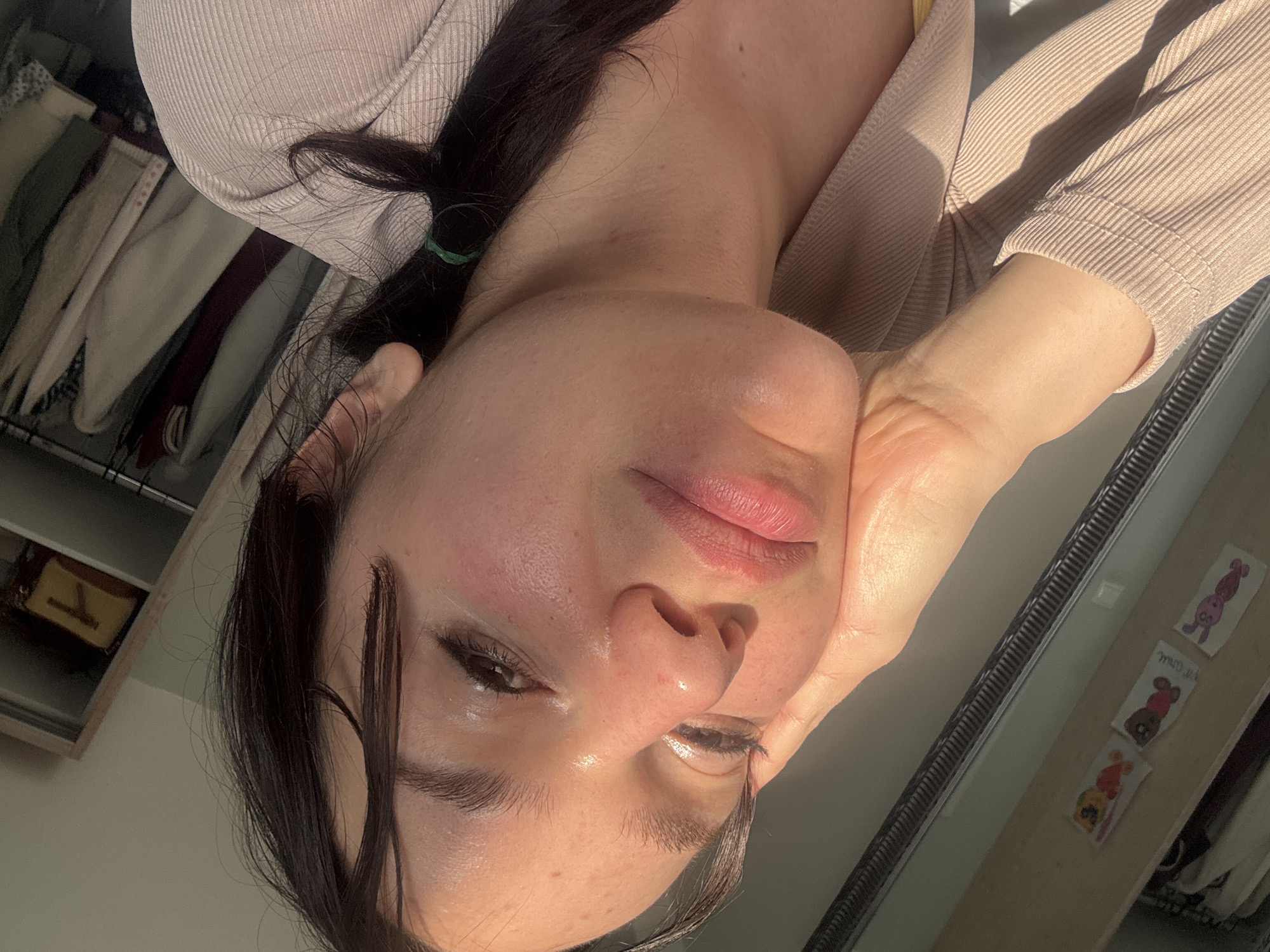 A close-up, rotated selfie of a fair-skinned person with dark brown hair, positioned indoors
