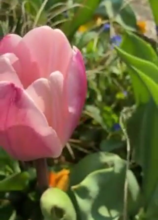 close-up of a pink tulip in a flower bed. The tulip is the primary focus, with its petals exhibiting a gradient of pink and white. The flower bed also contains green leaves, blue forget-me-nots, and yellow pansies. The background includes a pavement or road.