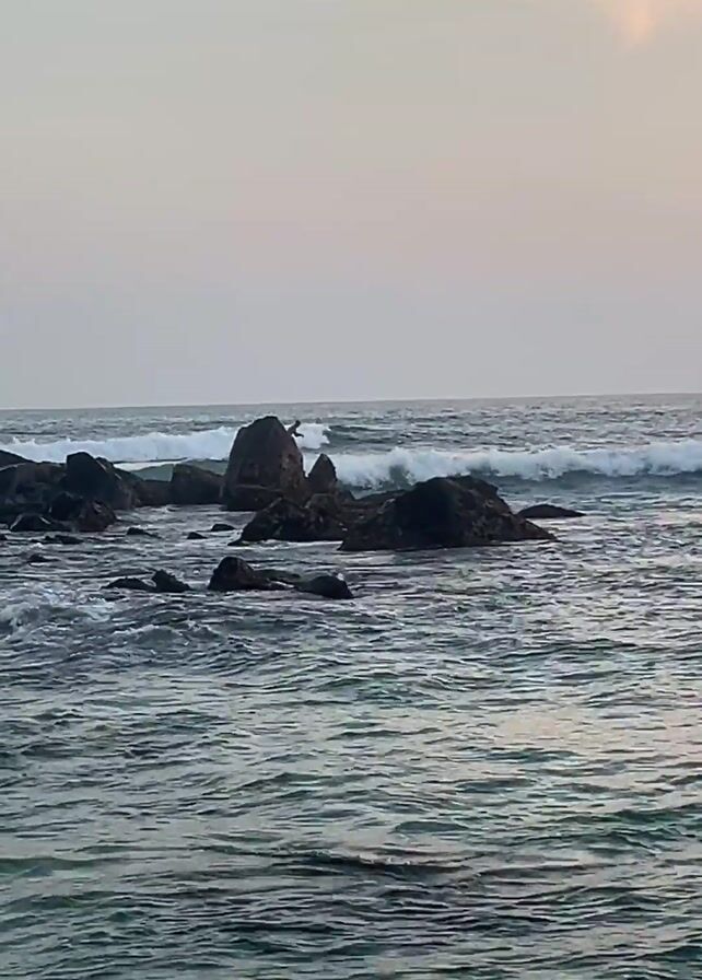 The video captures a surfer riding a wave amidst a rocky shoreline