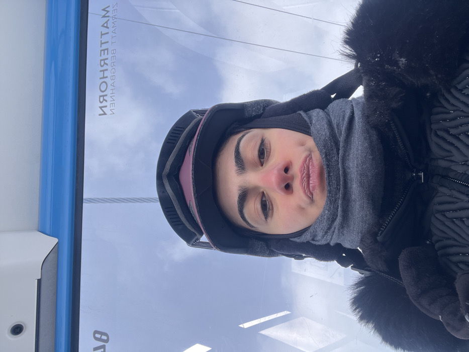 A young individual, appearing female, is depicted in a close-up selfie taken inside a gondola cabin. The subject is wearing dark ski attire, including a black or dark grey helmet with a maroon peak and ski goggles pushed up on top. A grey neck gaiter covers the lower face and neck, and a dark winter jacket, possibly with fur trim on the shoulders or hood, is visible. Dark gloves are also worn. The individual's nose is noticeably reddened, and their lips are pursed in a slight pout. Their eyes are light brown, and dark eyebrows are prominent. Through the window of the gondola, a cloudy sky is visible. Reflected text on the window, read correctly, clearly states "MATTERHORN BERGBAHNEN" and "ZERMATT", unequivocally indicating the location as Zermatt, Switzerland. A blue frame of the gondola cabin and a suspension cable are also discernible through the window. The subject is looking directly into the camera, capturing the self-portrait within the cable car environment.