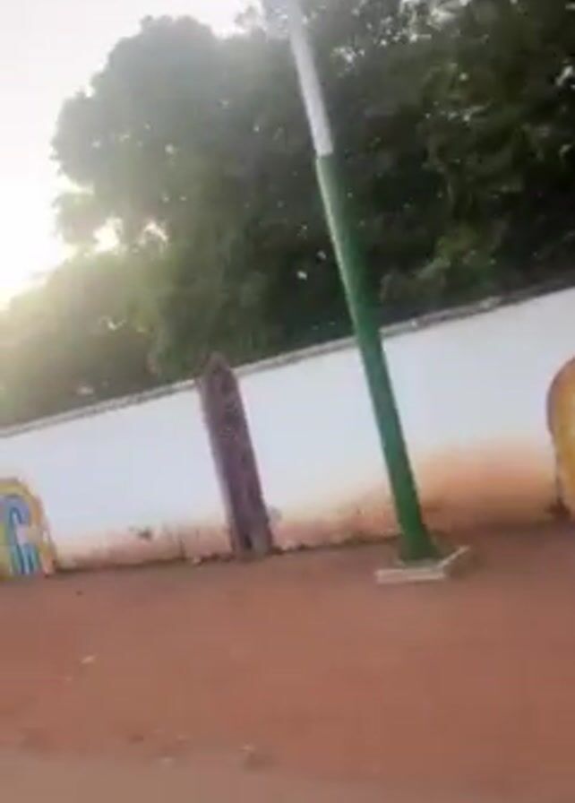 low-angle shot of a street on a sunny day. A white wall runs along the right side of the frame, adorned with a colorful archway painting. Power lines and trees are visible in the background. The ground is a reddish-brown color. The camera moves slowly along the street.