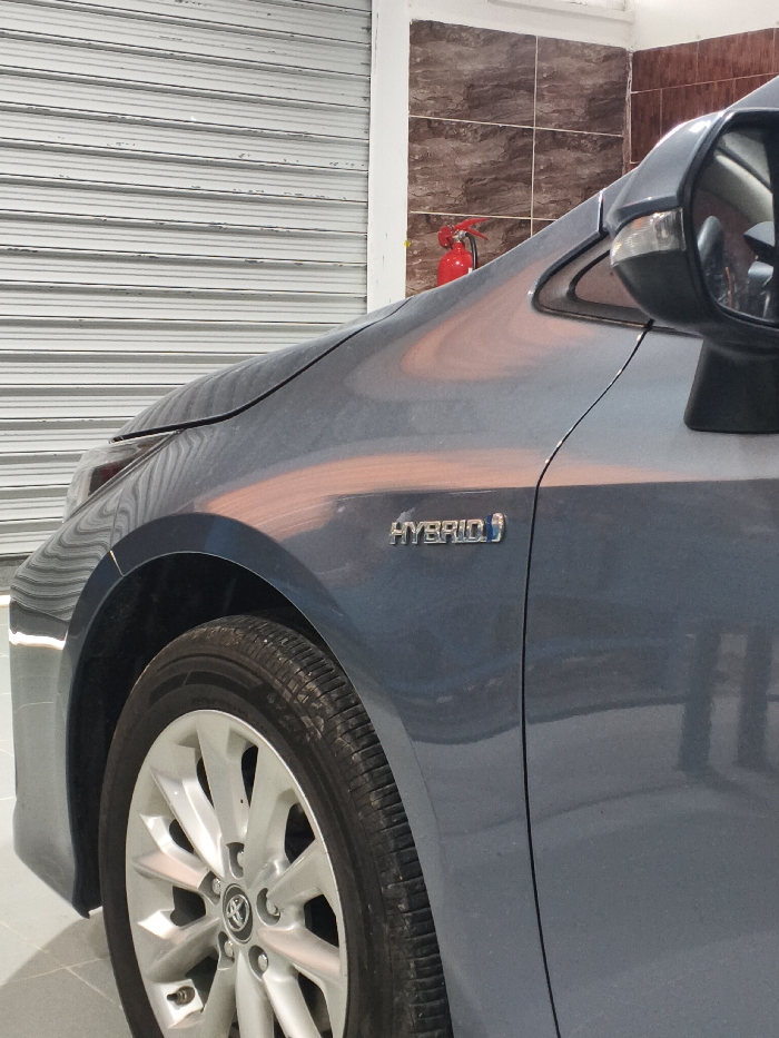 - "The image displays a partial view of the front driver's side of a dark gray or blue metallic hybrid vehicle, located indoors in طبقة فحل, Jordan" by FM-vaLyj1, licensed under CC BY 4.0