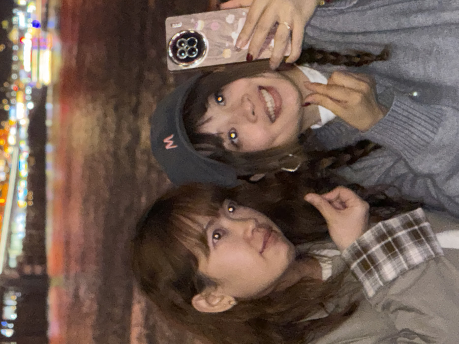 The image displays two East Asian females captured at night in an urban waterfront setting