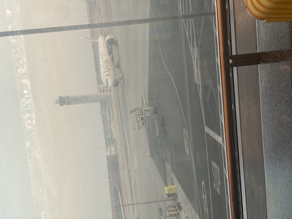View through a window overlooking an airport tarmac. A Qatar Airways plane is visible, alongside a control tower and ground vehicles. The tarmac is marked with stop lines and other airport signage. The scene is hazy, possibly due to weather conditions or the window's cleanliness. The window frame is visible on the right side of the image.
