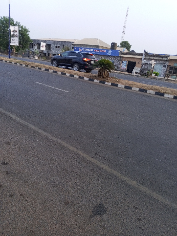 The scene depicts a street in Oko Erin, Nigeria, captured during daylight under a uniformly light, overcast sky. The foreground features a two-lane asphalt road with a dashed white lane divider. Irregular dark stains are present on the road surface. A concrete median strip, bordered by alternating black and white painted curbs, separates the roadway from the commercial establishments on the right. A single, small, palm-like plant grows from the median. A dark-colored SUV, likely black or dark blue, is in motion on the road, traveling from left to right. Its rear lights are illuminated, and motion blur is evident, indicating its movement. No individuals are discernible within the vehicle or elsewhere in the scene. On the right side of the image, beyond the median, a series of commercial buildings are visible. A prominent two-story building features a large blue sign with white lettering that reads "EXTRACARE UNISEX SALON." Adjacent to this, other single-story commercial structures display various storefronts, one partially visible with the text "CHIMS." A dark-colored water tank is mounted on the roof of one of these buildings, and a tall, slender metal tower or antenna rises in the distant background. On the far left, a blue pole supports two white banners, one partially visible displaying "MAHMAZ."