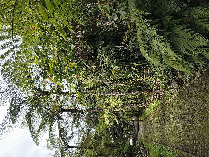 The image depicts a verdant, overgrown pathway within a botanical garden or similar natural area in an unspecified city in Vietnam. A moss-covered cobblestone path, approximately 1.5 meters wide, recedes diagonally from the lower-left foreground towards the center-left background. Tall, slender tree ferns with wide, umbrella-like fronds dominate the central and left portions of the image, reaching towards an overcast sky. The right side and foreground are densely populated with lush green foliage, including large fern fronds and various broad-leafed tropical plants. In the distant background, to the left of the path, a structure with multiple light-colored, angled metal roofs is partially visible, suggesting a pavilion or shelter. The environment is characterized by dense vegetation and diffused natural light. No individuals or animals are present in the scene.