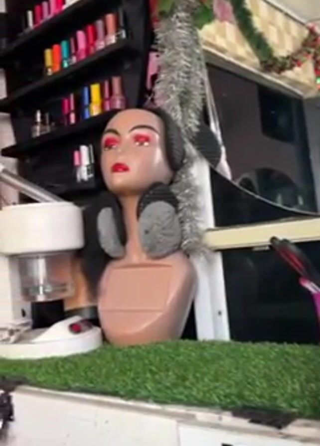 n indoor shot of a beauty shop counter. A pink mannequin head with red eye makeup and grey earmuffs is centered behind artificial turf on the counter. To the left of the mannequin is a facial steamer. Shelves with various nail polishes and other beauty items are on the wall behind the counter. Garlands with leaves and flowers are hung on the wall, and a silver tinsel strand is draped across the top of the counter. Various hair extensions and supplies are displayed on the left side of the counter. A partial view of someone sitting or standing behind the counter is also visible.