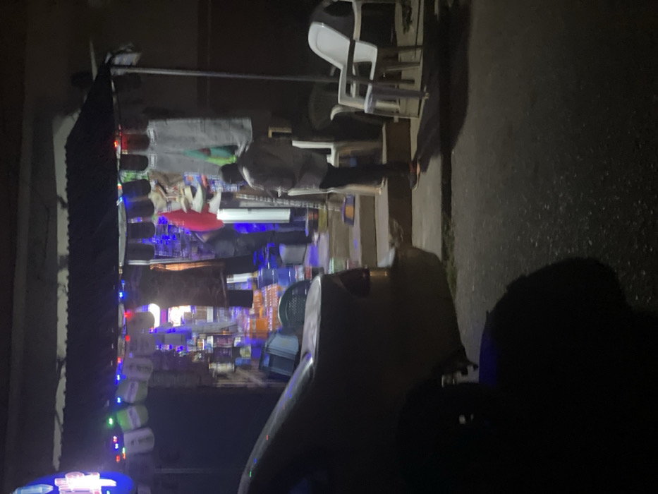 The image depicts a nighttime scene on a street in Jos, Nigeria, focusing on a brightly lit small shop. The foreground features the rear section of a light-colored sedan, parked or stopped on the left, partially obscuring the view. The street surface is dark asphalt. The shop, centrally positioned, has a corrugated metal awning adorned with multicolored string lights. A blue neon-like sign is visible on the far left of the shop's facade. The shop interior is illuminated with a strong blue and purple hue, revealing shelves stocked with numerous items, including bottles and containers. Various merchandise, such as clothing items, bags, and shoes, are hung from the awning structure. A male individual, wearing a light-colored long-sleeved shirt and dark trousers, stands on the concrete steps leading into the shop. He is facing slightly away from the camera, appearing to look downwards at an object in his hands. A broom is leaning against the steps near his feet. Another person is partially visible within the shop, obscured by the merchandise and interior lighting. To the right of the shop entrance, several plastic chairs are arranged. Two white plastic chairs are clearly visible, one upright and another partially stacked or folded. The immediate ground in front of the shop consists of a concrete sidewalk leading to the steps. The overall environment is dark, with artificial light emanating from the shop.