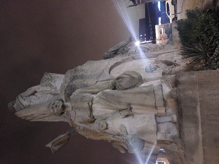 A concrete sculpture dominates the frame, depicting figures lying in repose