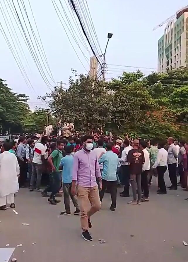 A medium shot shows a crowd of people gathering in the middle of a street, many looking towards the center of the gathering. The street is littered with debris, suggesting possible disturbances. Most of the individuals are dressed casually. A man in a light purple shirt and khaki pants walks towards the camera. An ambulance is parked on the side of the road. Tall buildings and construction cranes rise in the background. Overhead, power lines crisscross. The sky is overcast.