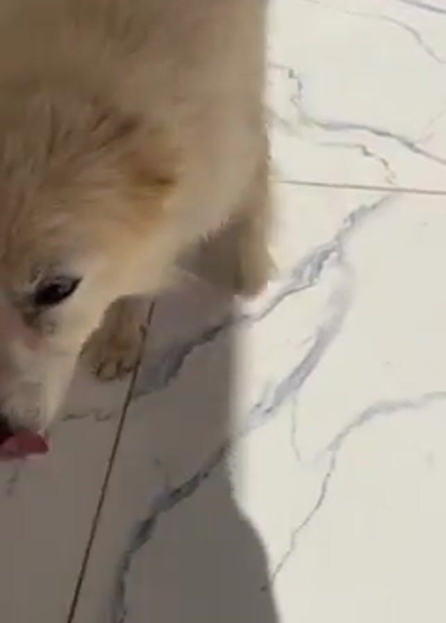 fluffy, light-colored dog, possibly a Pomeranian mix, licking its nose and then its paws on a tiled surface with a white and gray marble pattern