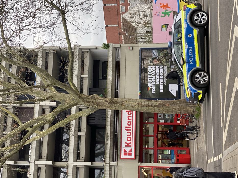 The image captures a street scene in Heidelberg, Germany, specifically at the Kaufland supermarket located at Kurfürsten-Anlage 61. The setting is daytime under an overcast sky, with a large, bare deciduous tree prominently featured in the foreground, indicating late autumn or winter. The primary structure is a multi-story concrete apartment building with numerous recessed balconies and dark-framed windows, housing the Kaufland store at its base. The Kaufland entrance is marked by a red sign with white "Kaufland" lettering and logo, featuring red automatic sliding doors. A German police vehicle, a dark blue and yellow "POLIZEI" branded Audi Q4 e-tron with blue roof lights, is parked parallel to the curb on the street in front of the store, facing right. Its license plate starts with "HD-". Adjacent to the Kaufland entrance and beneath the tree, a large billboard displays a German military recruitment advertisement with a soldier and the text "HEUTE DEN FRIEDEN VON MORGEN VERTEIDIGEN" (Today defend tomorrow's peace). Several individuals are present: A person wearing a dark backpack is partially visible on the far left sidewalk. Multiple individuals are near the Kaufland entrance, some entering or exiting. A person in dark attire stands near a red waste bin to the left of the entrance. Two bicycles, one dark-colored and one with a red basket, are parked near the store entrance. Another person in dark clothing stands near the billboard, facing towards the street and police vehicle. On the far right, a pink wall is visible, adorned with a colorful mural depicting stylized dancing figures. In the background, a white house with a brown pitched roof and a larger reddish-brown building are present.